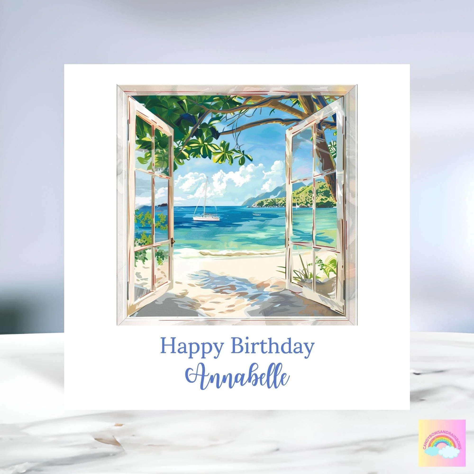 Personalised Beach Birthday Card – Beach View, Bespoke Name