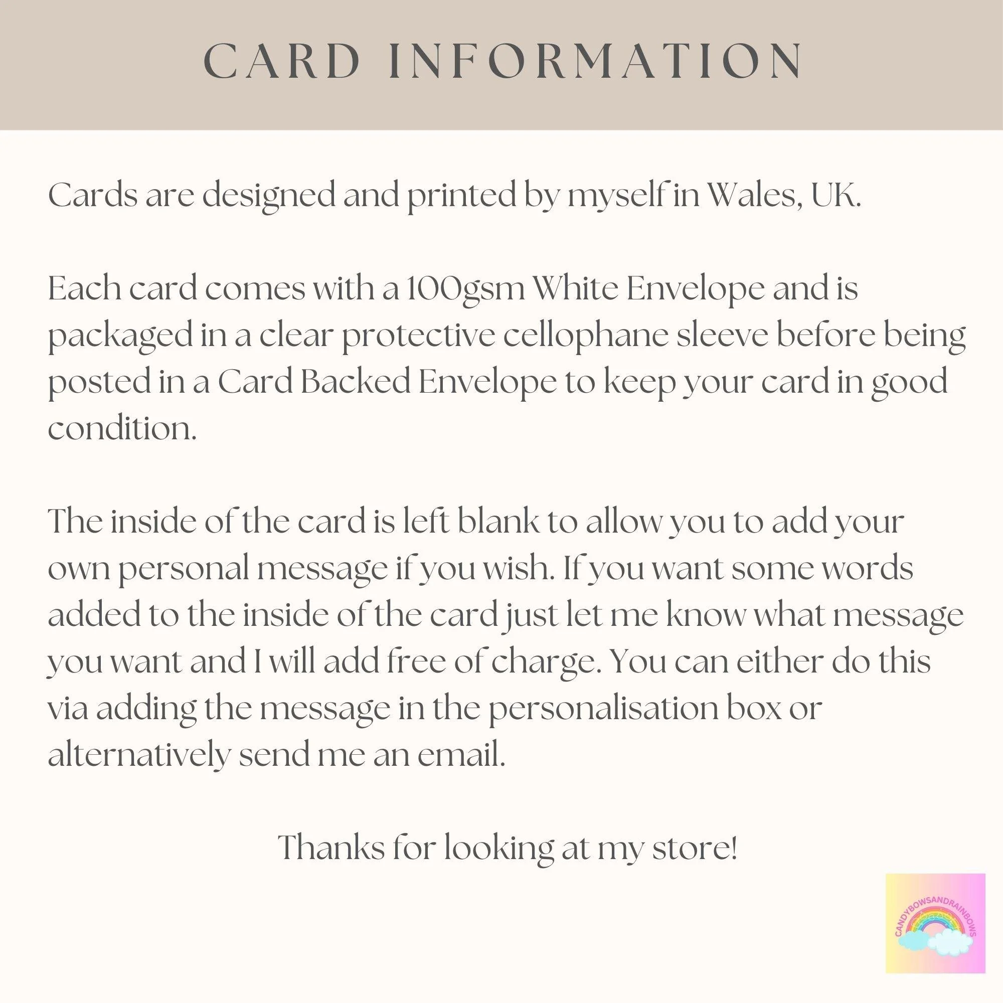 Please Note - The longer the words chosen on the front of the card may result in the need for some small amendments to the design to accommodate the details requested.