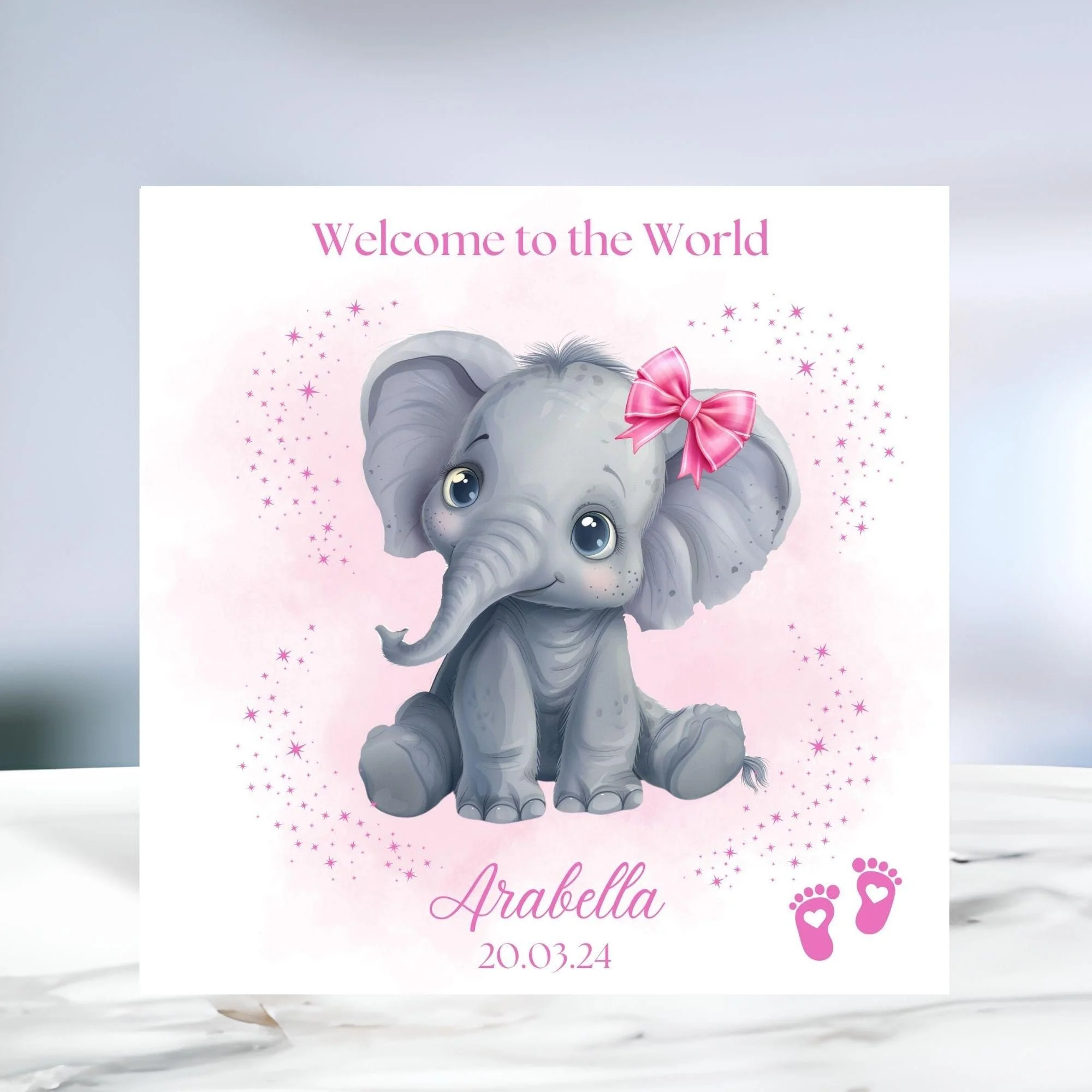 Personalised New Baby Girl Card - Cute Baby Elephant Baby Girl Birth Congratulations Card - Welcome to the World Card