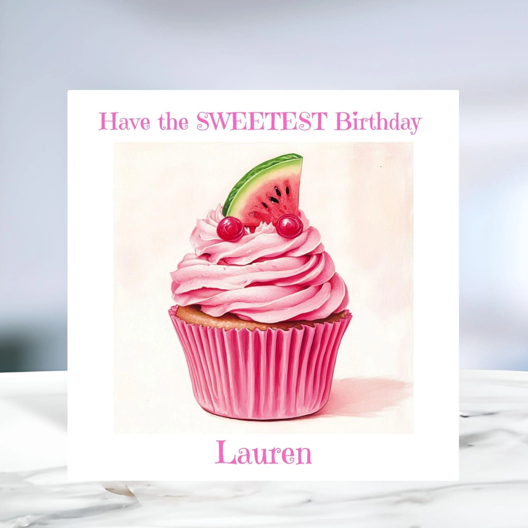 Personalized Watermelon Cupcake Birthday Card: Pink Sweetest Birthday